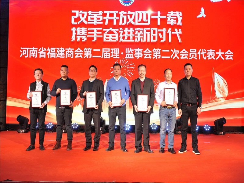 河南省福建商会会长陈锦焰(右一)为我集团副董事长钟剑文(从左往右第三位)授牌